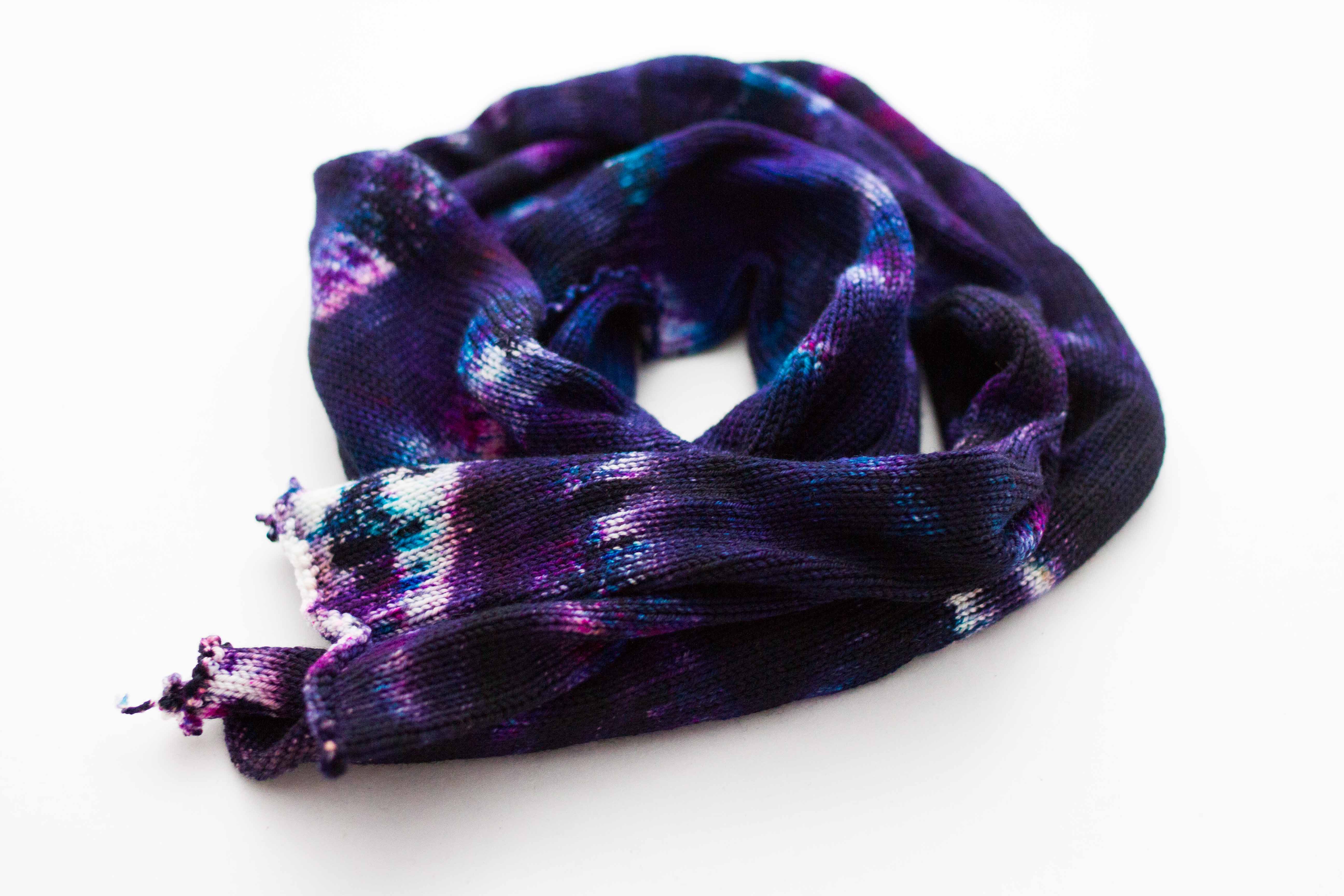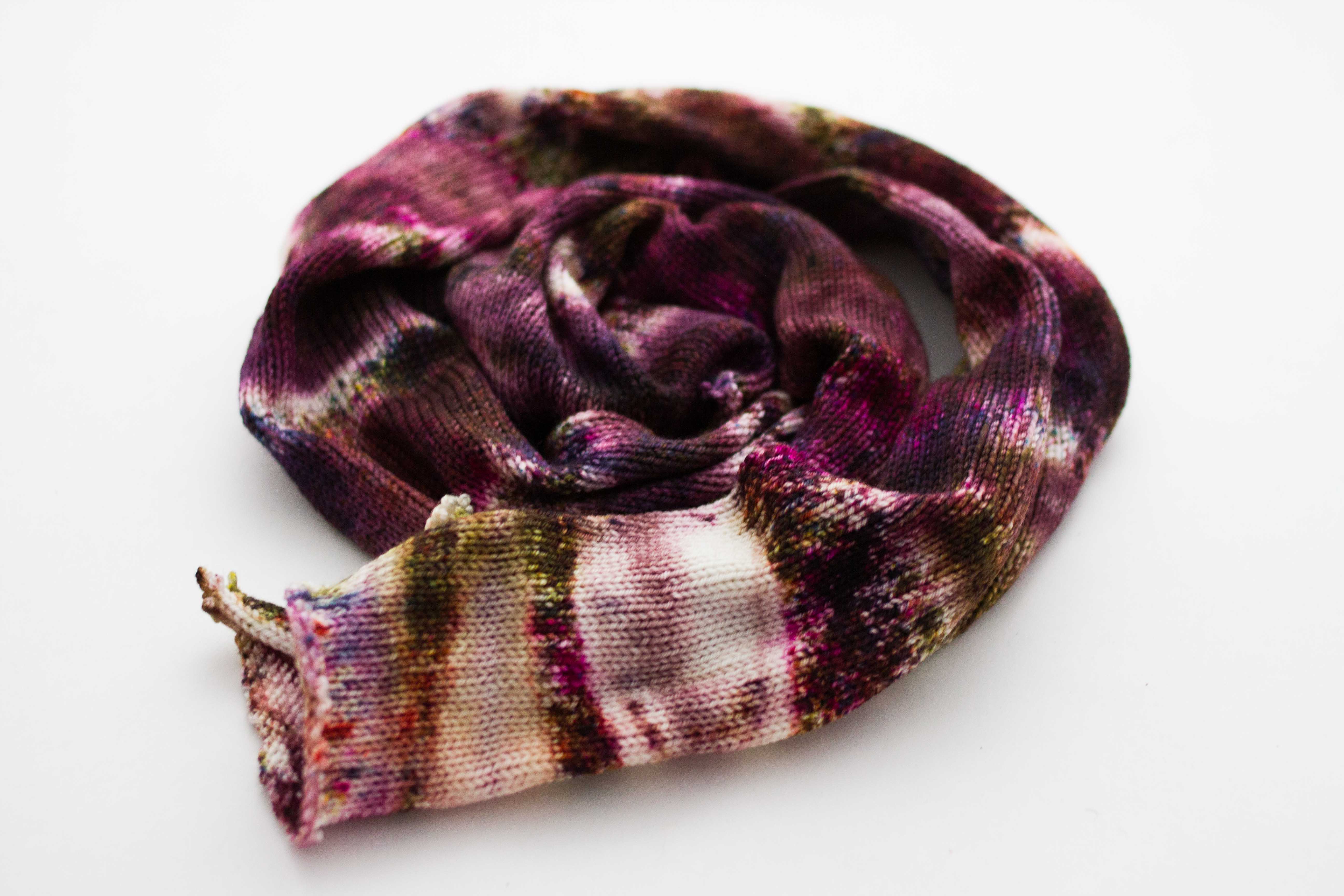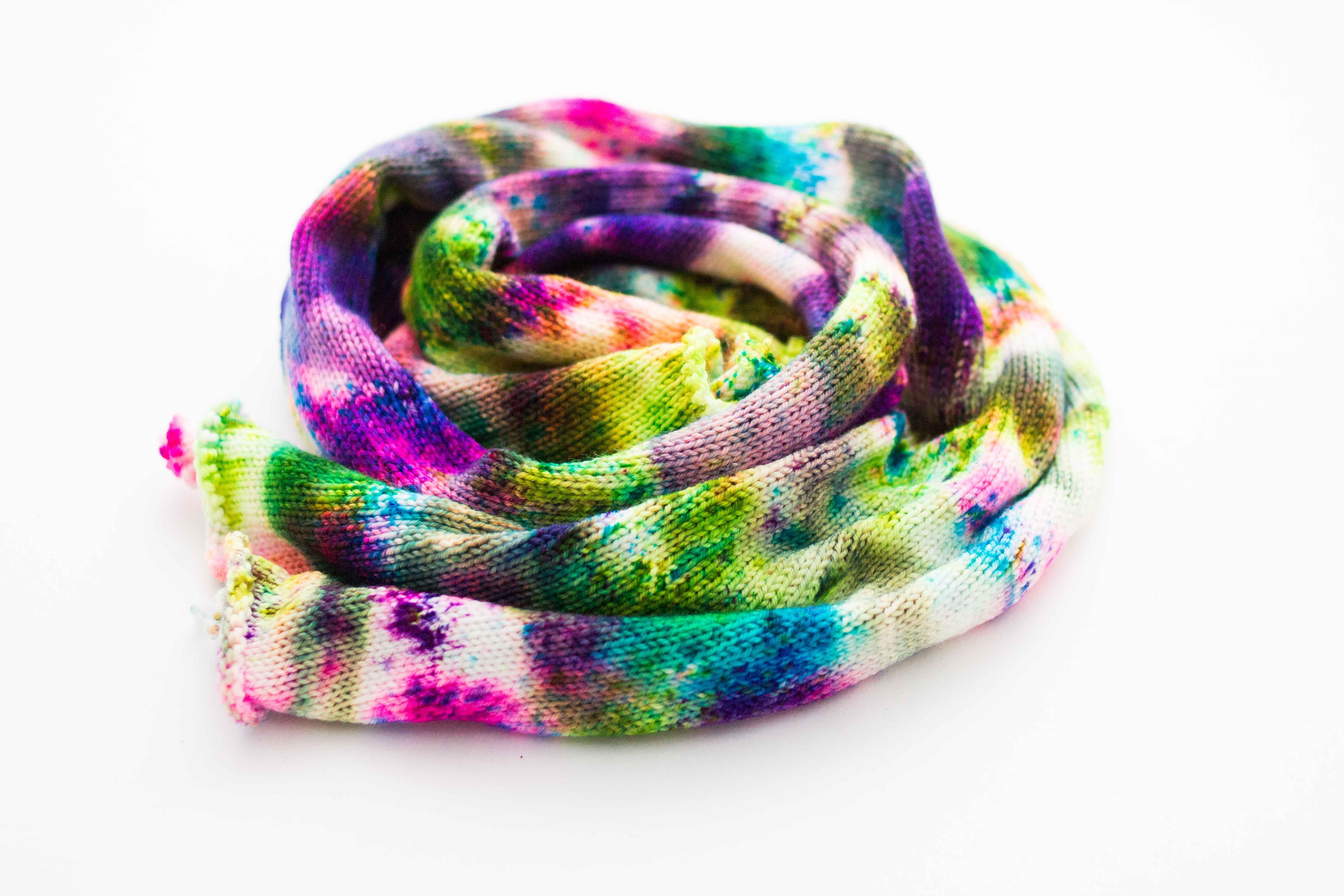 We dye directly on the knitted fabric so unraveling the blank produces a more speckled and spotted effect.